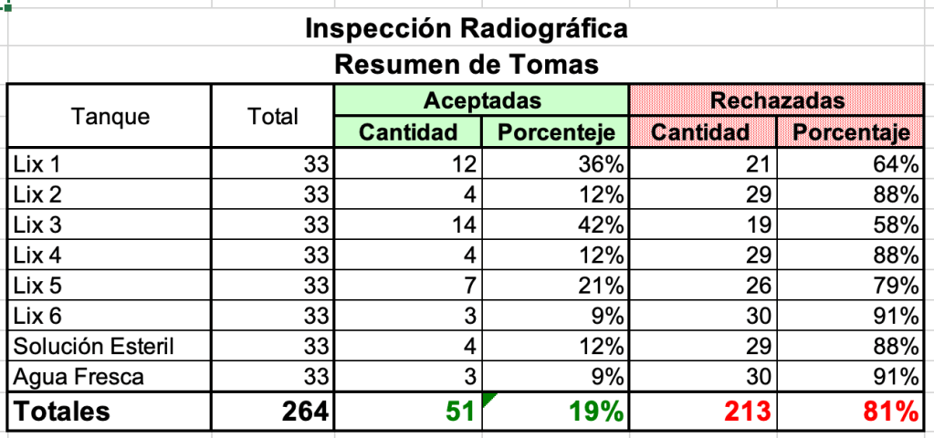 De los 8 tanques inspeccionados, al que mejor le fue tuvo un 58% de soldaduras rechazadas; el peor: 91% de soldaduras rechazadas. En promedio, de 264 puntos de muestreo analizados, 213 soldaduras (81%) no cumplían con los criterios de aceptación del estándar aplicado (Estándar API 650). Al presentar los resultados, propusimos coordinar una visita para marcar sobre las soldaduras los defectos detectados de modo que pudiesen iniciar las tareas de reparación.