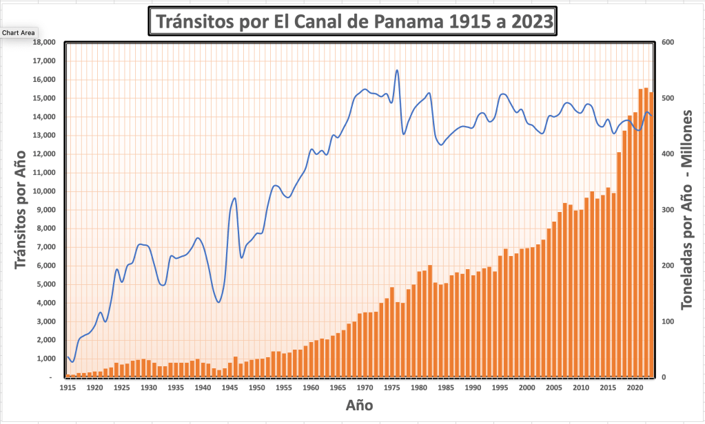 En el lapso de 32 años entre 1967 y 1999, el número de tránsitos anuales se mantuvo sobre la cifra de 14,000 al año. La cantidad de carga que cruzó el istmo fue incrementando de 80 millones de toneladas canaleras hasta 225 millones de toneladas canaleras. Estas tendencias son indicativas de que los armadores del mundo fueron construyendo buques cada vez más grandes para aprovechar al máximo la capacidad de las esclusas y hacer mejor uso de las economías de escala.